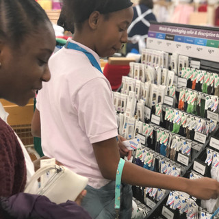 Recently the Design Academy quartet: Morgan Ginn, Chole Gross, Nyela Davis, and Klarke Monroe went on a trip to Joann's to choose their fabric and important notions for their pieces. One student, Klarke, searched and searched for a 30 inch zipper that she would be putting down the side of the pants she would be creating. Another student, Nyela, racked her brain between two different floral patterned fabrics, trying to determine which one would fit her theme of spring. In the end she chose a white fabric with red roses.