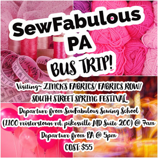 3. SewFabulous PA Bus Trip MAY 4TH: Visiting Zinck's Fabrics, Fabrics Row, and South Street Spring Festival. Meeting at Sew Fabulous @ 7am, Departing PA @ 5pm